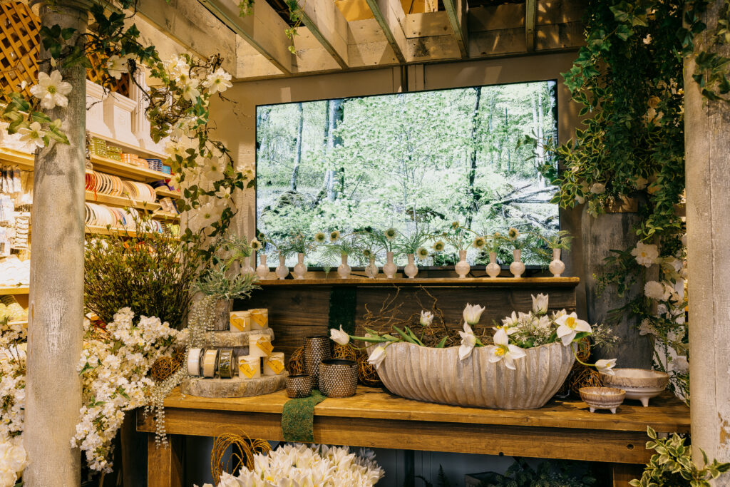 Grounding the display is a neutral palette that allows every detail to shine, while a runway of cement bases lined with petite vases bursts with cheerful summer hues. Surrounding the scene, you’ll find timeless whites and greens, artisanal pottery perfect for dish gardens, delicate glassware suited for elegant tablescapes, and thoughtfully curated accents-from baskets and ribbon to classic taper candles. Together, it’s a balanced blend of bold statement and everyday inspiration, designed to spark ideas the moment you arrive.