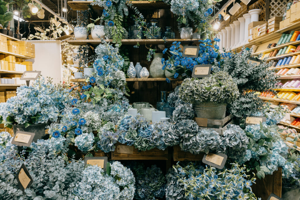 This vignette near our Permanent Botanicals room is a cool, calming statement that draws you in with layers of soft blue tones and textural depth. A lush cascade of blue hydrangea, dusty eucalyptus, and delicate accent blooms spills from elevated shelving down into oversized metal vessels, creating a sense of movement from top to floor. The monochromatic palette ranges from powdery sky blues to deeper slate hues, giving the display a serene, almost coastal feel while still feeling elevated and design-forward.