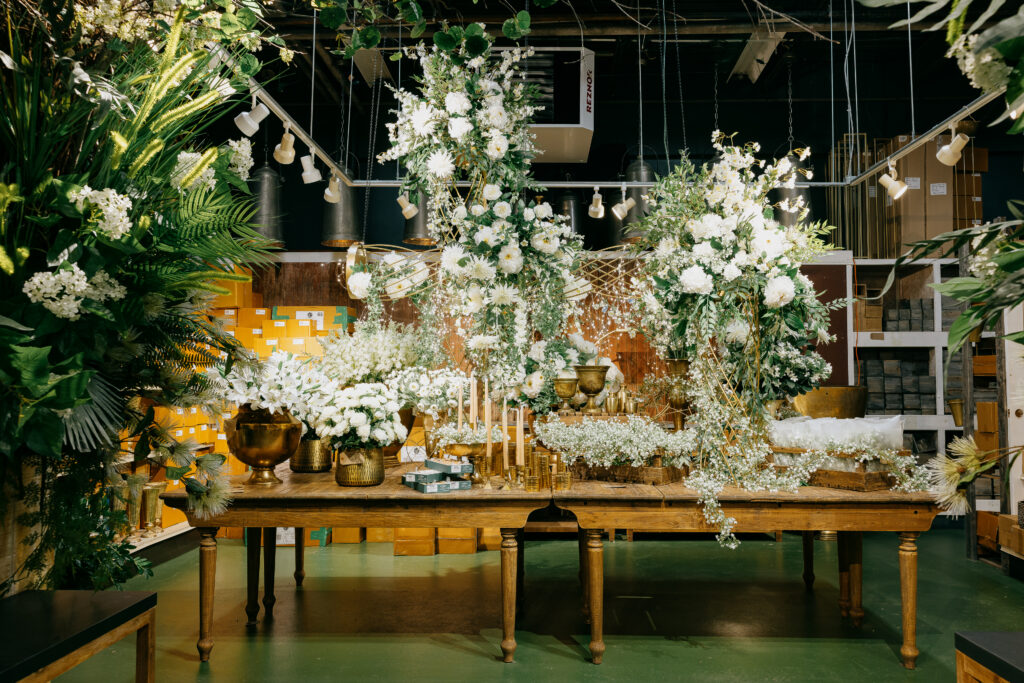Airy florals in whites and creams are arranged in abundance, featuring textural blooms and delicate fillers that spill and trail naturally across the table. Overhead, suspended greenery and floral elements add movement and dimension, drawing the eye upward and demonstrating large-scale installation possibilities. In this case, the creative use of Accent Decor tables turned on their side and hung as armature for floral design.