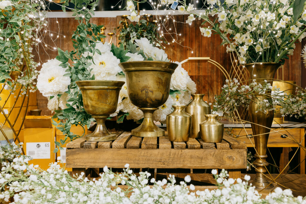 Gold vessels in varied shapes and sizes ground the design, showcasing versatility for events-from statement centerpieces to smaller accent pieces. The use of wood tables, crates, and natural materials softens the metallics and creates an approachable, garden-meets-industrial aesthetic.