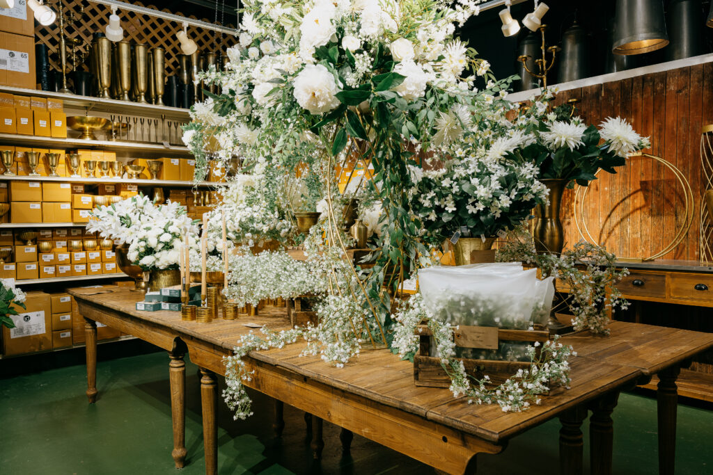 The balance between airy florals and structured branching overhead gives the vignette both movement and architecture. It’s romantic yet approachable-perfectly suited to inspire wedding palettes, summer events, and seasonal merchandising with a warm, inviting glow.